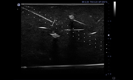 Obraz igły punkcyjnej jest wzmocniony przez odchylenie wiązki akustycznej, obejmujące wzmocnienie igły, renderowanie czerwonego końca igły, wirtualny przebieg igły oraz linię skali, wspierające automatyczne sterowanie.